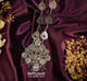A grand long necklace featuring an ornate silver chain with gold-toned floral links, leading to a regal rectangular pendant. The pendant is richly embellished with a mosaic of red, white, and green stones, traditional floral carvings, and crescent and paisley danglers in mixed metal tones.