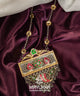 An elaborate silver necklace featuring stylized leaf elements and peacock motifs studded with green and red stones. The centerpiece is a rich, intricately hand-carved pendant showcasing a central figure surrounded by a medley of temple-inspired floral and geometric motifs.